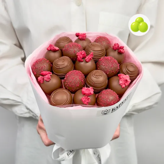 Состав: виноград в шоколаде 300 г. НОВИНКА! Это не обычный виноград, а ягоды премиального сорта шайн мускат без косточек. Сублимированная малина дополняет композицию вкусов лёгкой кислинкой и украшает букет. Стильная открытка-инструкция в качестве бесплатного бонуса. Отличный подарок бабушке, маме, любимой женщине, жене, подруге, сестре, друзьям и коллеге.