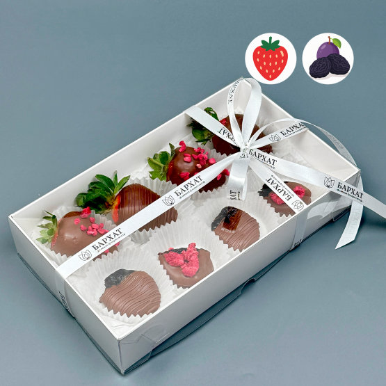 НОВИНКА! Прекрасная возможность попробовать сразу два изысканных вкуса в одной коробочке! Классическое сочетание нежной клубники в фирменном шоколаде с новым вкусом: сочный чернослив в благородном шоколаде. Чернослив - чемпион по содержанию антиоксидантов. Для сравнения, второе место занимает изюм с показателем в 2 раза ниже. Это настоящий anti-age десерт, сохраняющий ваше здоровье и молодость.