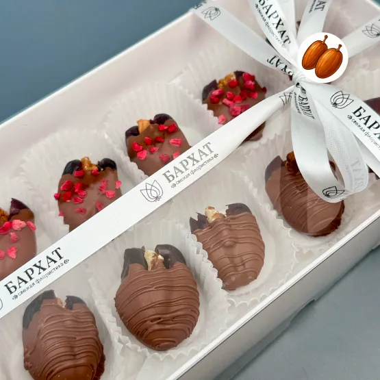 Состав: финики 10 шт. в шоколаде, с добавлением грецкого ореха и сублимированной малины. НОВИНКА! Восточная роскошь нового десерта: медовые финики, укутанные в фирменный шоколадный купаж. Яркий вкус  фиников дополняет грецкий орех внутри, придавая особенные текстуру и вкус десерту. Стильная открытка-инструкция в качестве бесплатного бонуса. Отличный подарок бабушке, маме, любимой женщине, жене, подруге, сестре, мужу, брату, дедушке, друзьям и коллеге.