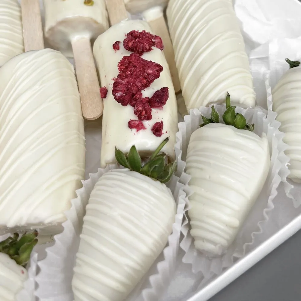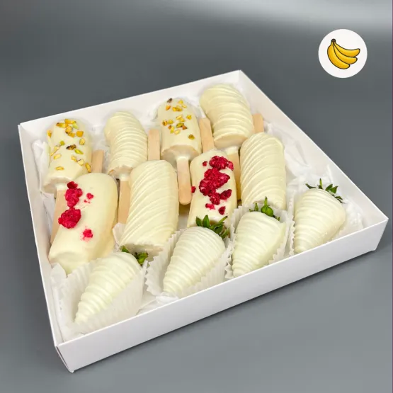 Мы собираем клубничные букеты по весу, а не по штукам. Количество, форма и размер ягод могут отличаться — ведь каждая ягода уникальна.