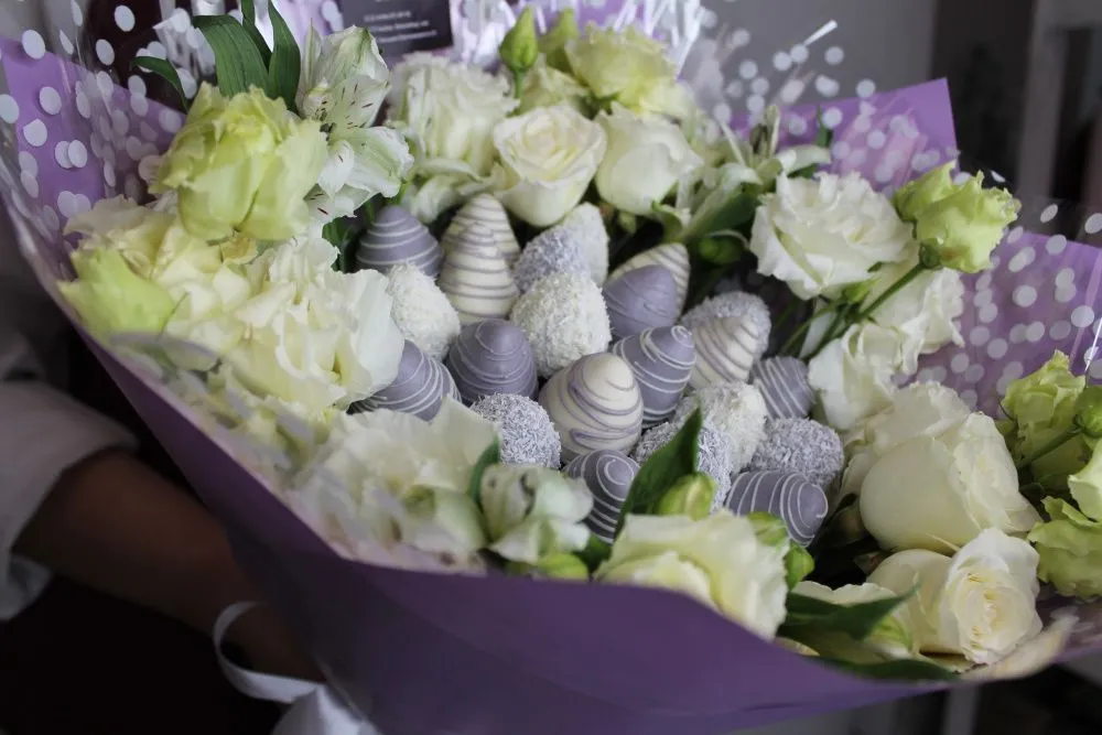 Букет из свежей клубники в бельгийском шоколаде и живых цветов. Клубника держится на каркасе из шпажек. Ягода отделена от цветов прозрачной пленкой. Готовый букет упаковывается в прозрачную слюду.