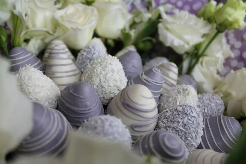 Мы собираем клубничные букеты по весу, а не по штукам. Количество, форма и размер ягод могут отличаться — ведь каждая ягода уникальна.