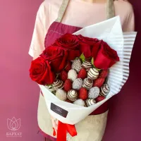 Мы собираем клубничные букеты по весу, а не по штукам. Количество, форма и размер ягод могут отличаться — ведь каждая ягода уникальна.