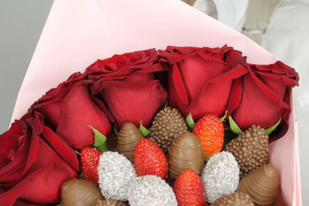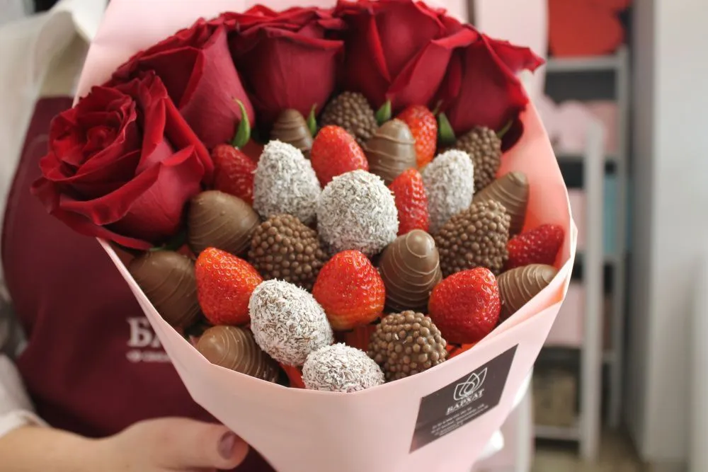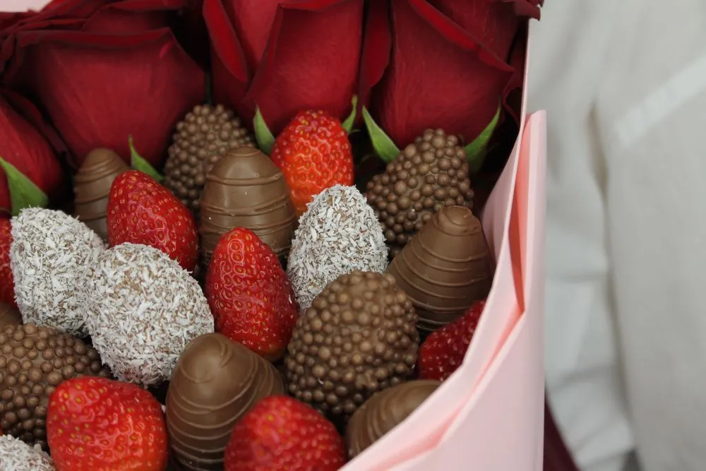 Мы собираем клубничные букеты по весу, а не по штукам. Количество, форма и размер ягод могут отличаться — ведь каждая ягода уникальна.