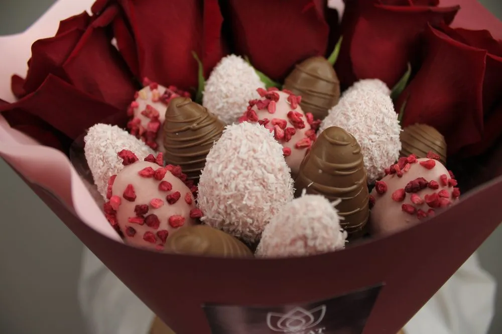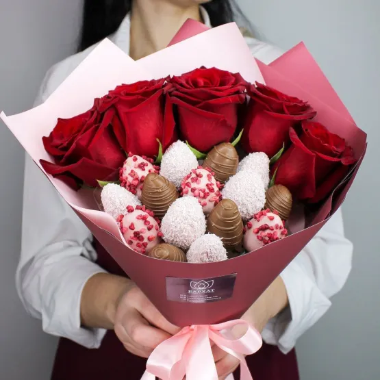 Этот букет — идеальный способ выразить чувства: ко дню рождения, годовщине, 8 Марта, 14 Февраля, Дню матери, Дню учителя, Дню бабушки и дедушки или просто в знак внимания и заботы. Букет из клубники и цветов — съедобный букет — отличный подарок бабушке, маме, любимой женщине, жене, подруге, сестре, друзьям и коллеге.