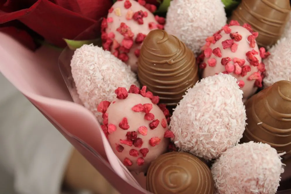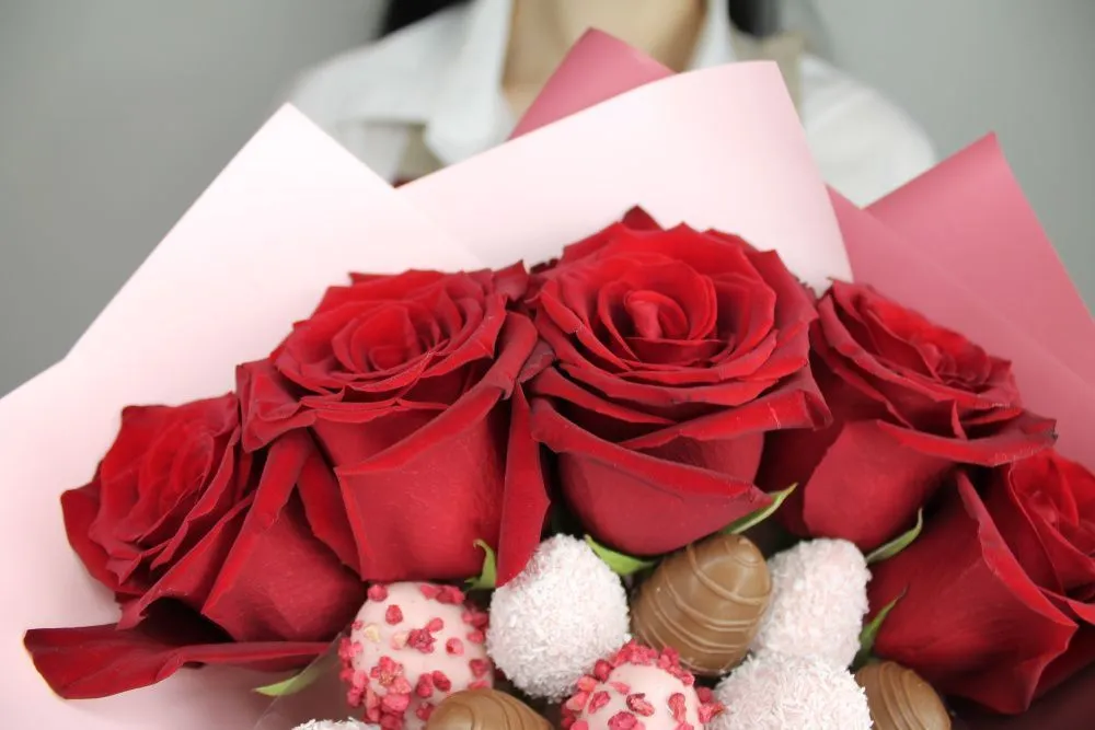 Мы собираем клубничные букеты по весу, а не по штукам. Количество, форма и размер ягод могут отличаться — ведь каждая ягода уникальна.