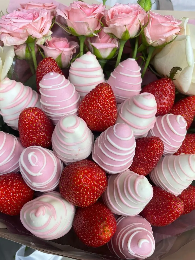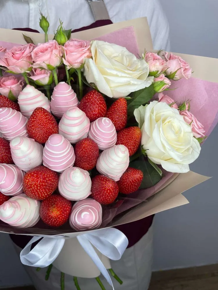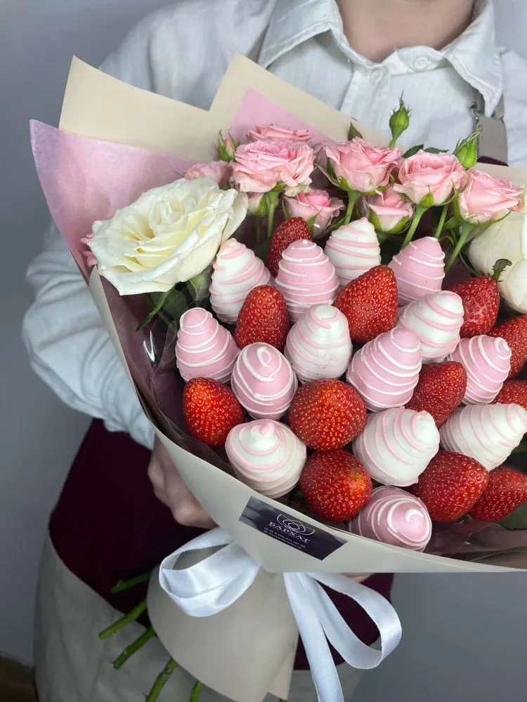 Мы собираем клубничные букеты по весу, а не по штукам. Количество, форма и размер ягод могут отличаться — ведь каждая ягода уникальна.