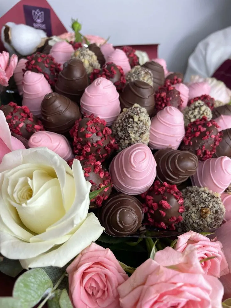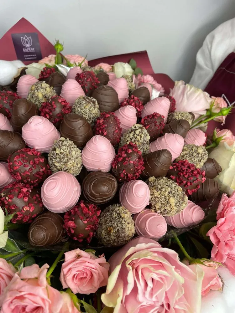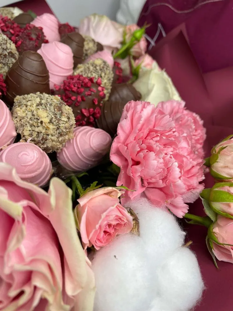Букет из свежей клубники в бельгийском шоколаде и живых цветов. Клубника держится на каркасе из шпажек. Ягода отделена от цветов прозрачной пленкой. Готовый букет упаковывается в прозрачную слюду.