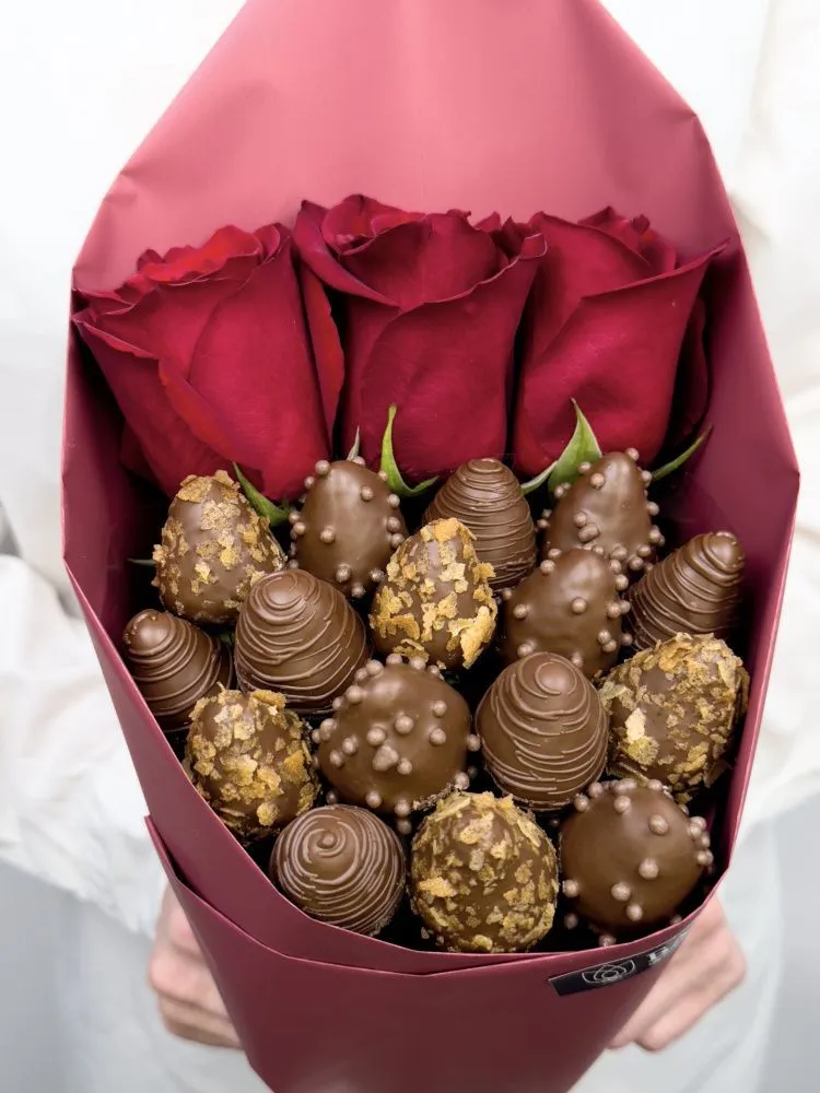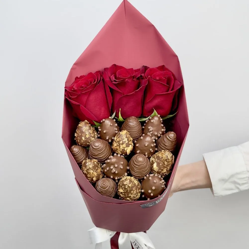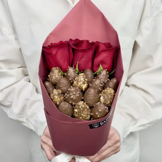 Состав: клубника в шоколаде 220 г., роза красная 3 шт. Букет из свежей клубники в бельгийском шоколаде и живых цветов. Клубника держится на каркасе из шпажек. Ягода отделена от цветов прозрачной пленкой. Готовый букет упаковывается в прозрачную слюду. Фирменная открытка-инструкция по хранению — в подарок. Этот букет — идеальный способ выразить чувства: ко дню рождения, годовщине, 8 Марта, 14 Февраля, Дню матери, Дню учителя, Дню бабушки и дедушки или просто в знак внимания и заботы. Букет из клубники и цветов — съедобный букет — отличный подарок бабушке, маме, любимой женщине, жене, подруге, сестре, друзьям и коллеге.