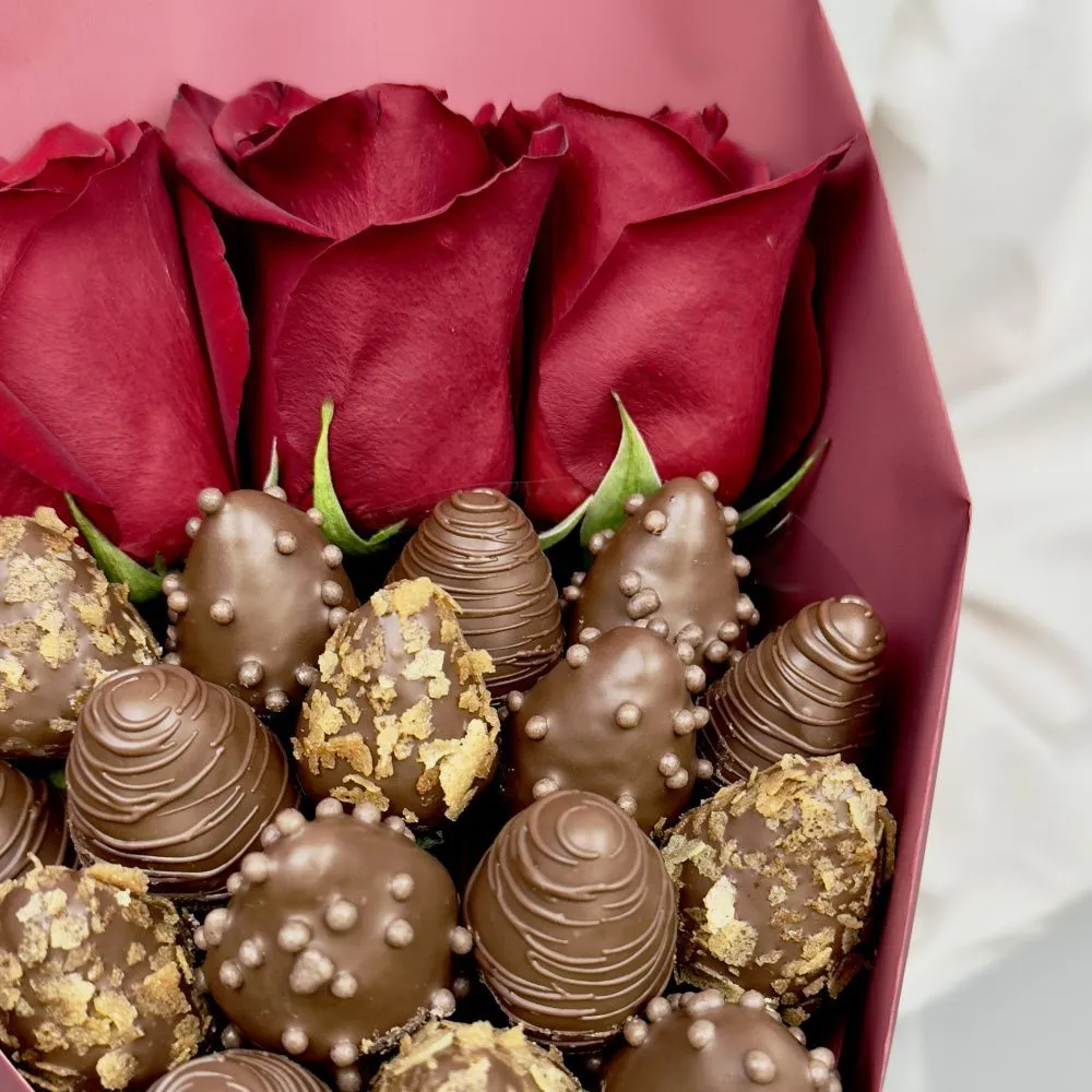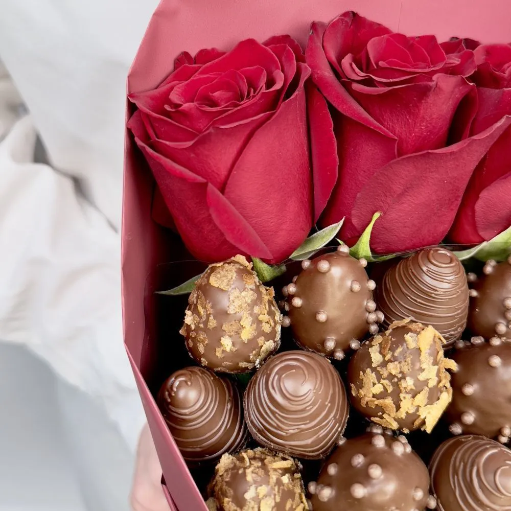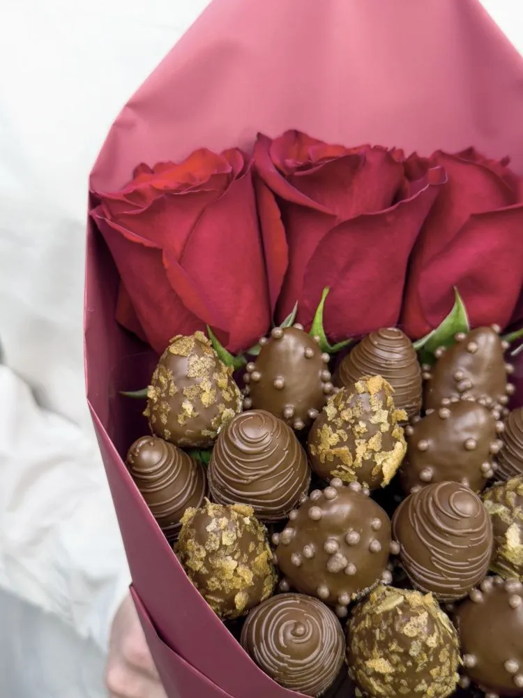 Мы собираем клубничные букеты по весу, а не по штукам. Количество, форма и размер ягод могут отличаться — ведь каждая ягода уникальна.