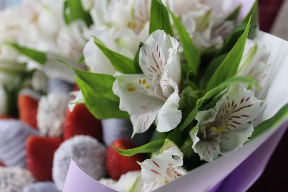 Мы собираем клубничные букеты по весу, а не по штукам. Количество, форма и размер ягод могут отличаться — ведь каждая ягода уникальна.