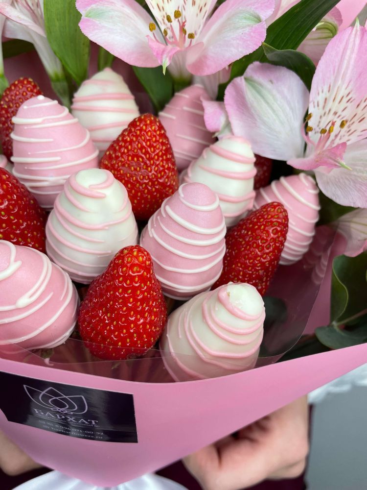 Мы собираем клубничные букеты по весу, а не по штукам. Количество, форма и размер ягод могут отличаться — ведь каждая ягода уникальна.