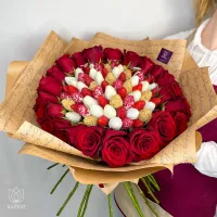 Мы собираем клубничные букеты по весу, а не по штукам. Количество, форма и размер ягод могут отличаться — ведь каждая ягода уникальна.