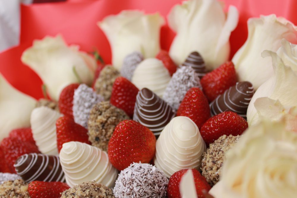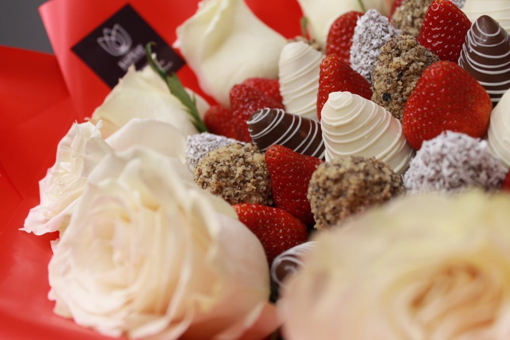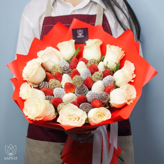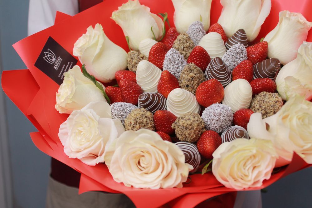 Мы собираем клубничные букеты по весу, а не по штукам. Количество, форма и размер ягод могут отличаться — ведь каждая ягода уникальна.