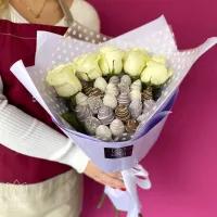 Мы собираем клубничные букеты по весу, а не по штукам. Количество, форма и размер ягод могут отличаться — ведь каждая ягода уникальна.
