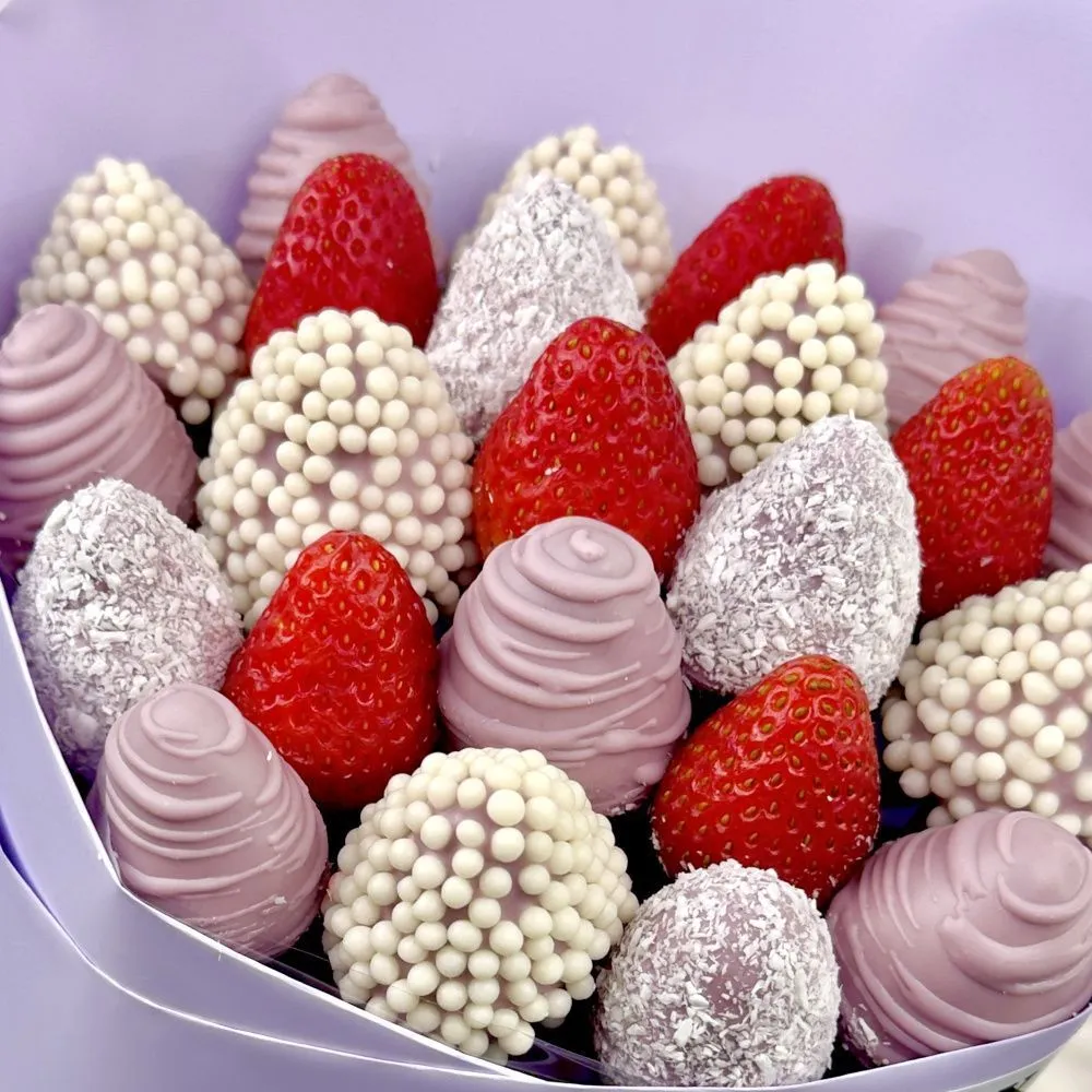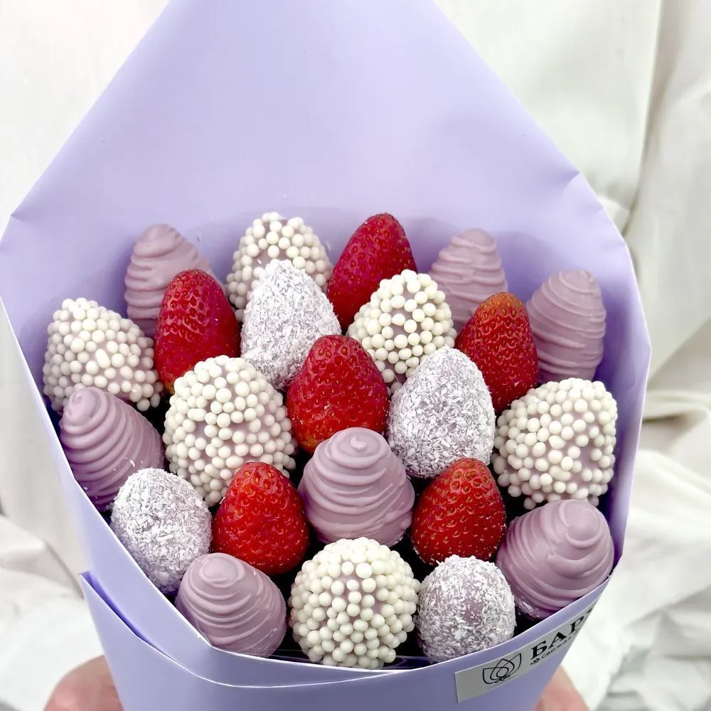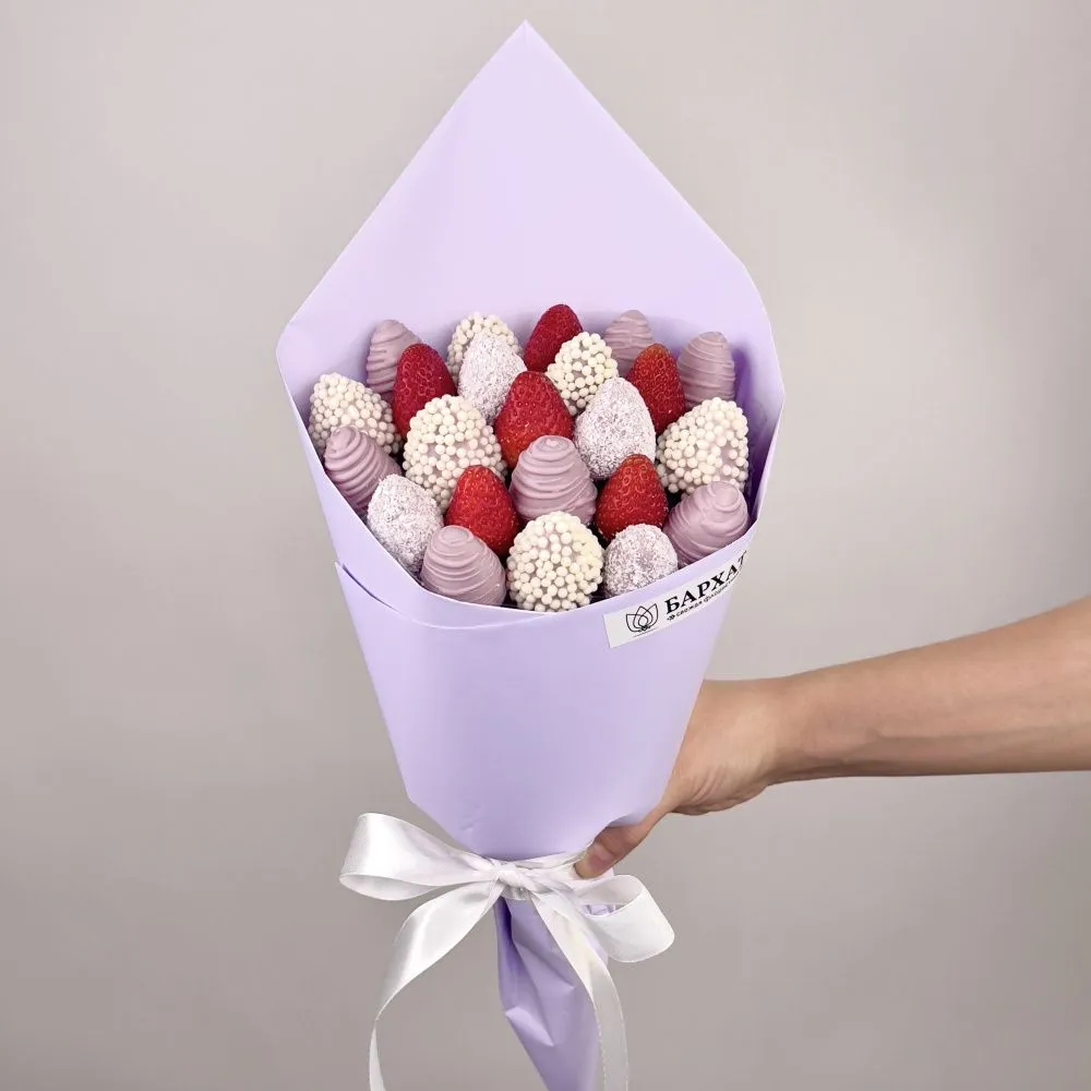 Мы собираем клубничные букеты по весу, а не по штукам. Количество, форма и размер ягод могут отличаться — ведь каждая ягода уникальна.