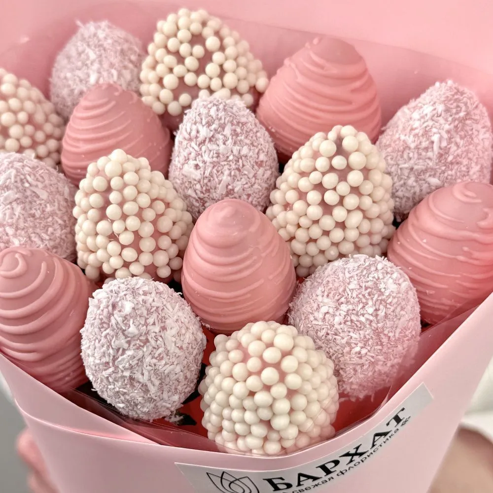 Мы собираем клубничные букеты по весу, а не по штукам. Количество, форма и размер ягод могут отличаться — ведь каждая ягода уникальна.