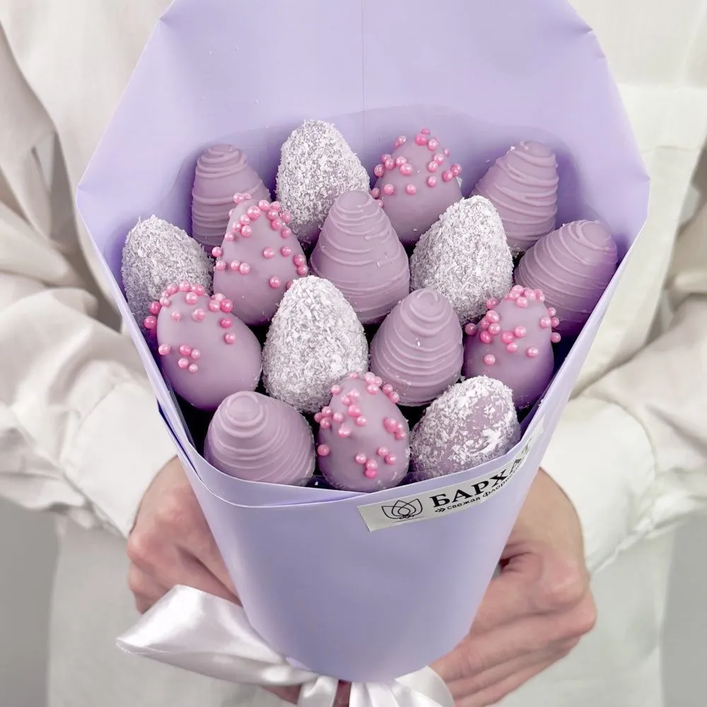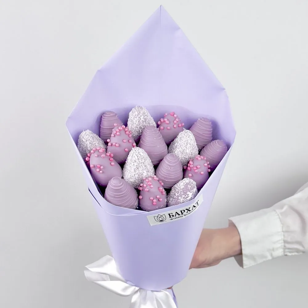 *Обратите внимание: изображение в карточке товара носит иллюстративный характер — реальный букет может незначительно отличаться от фото (например, по размеру клубники, форме и сборке). Точные размеры букета указаны в карточке товара.