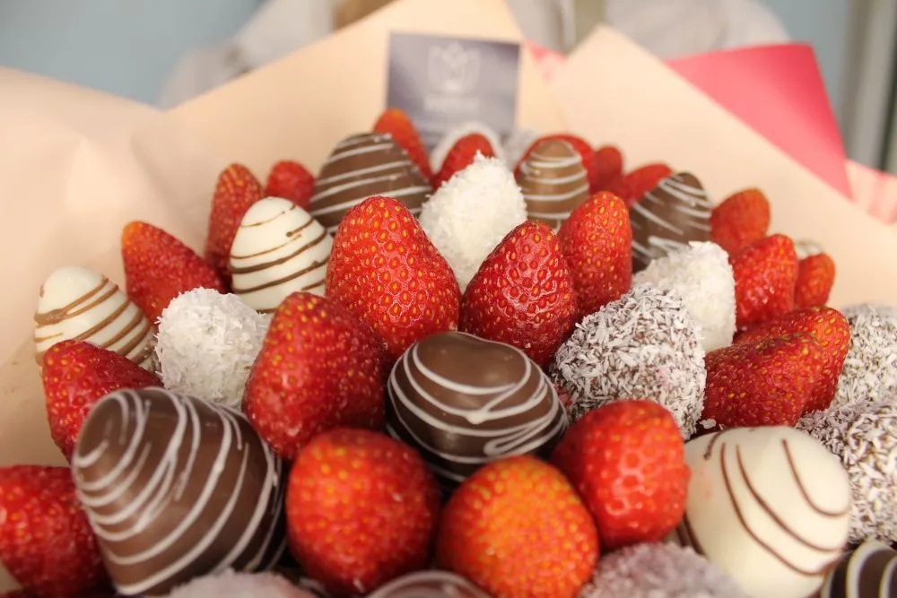Мы собираем клубничные букеты по весу, а не по штукам. Количество, форма и размер ягод могут отличаться — ведь каждая ягода уникальна.