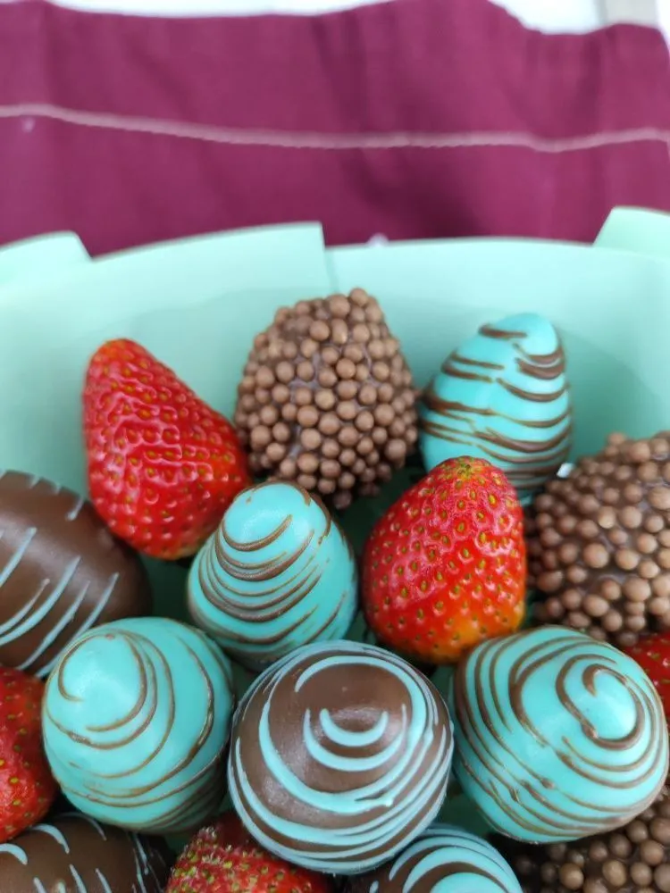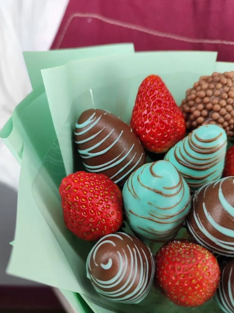 Мы собираем клубничные букеты по весу, а не по штукам. Количество, форма и размер ягод могут отличаться — ведь каждая ягода уникальна.
