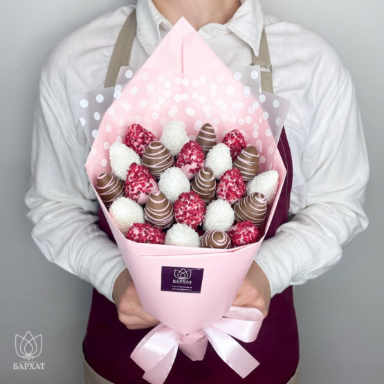 *Обратите внимание: изображение в карточке товара носит иллюстративный характер — реальный букет может незначительно отличаться от фото (например, по размеру клубники, форме и сборке). Точные размеры букета указаны в карточке товара.