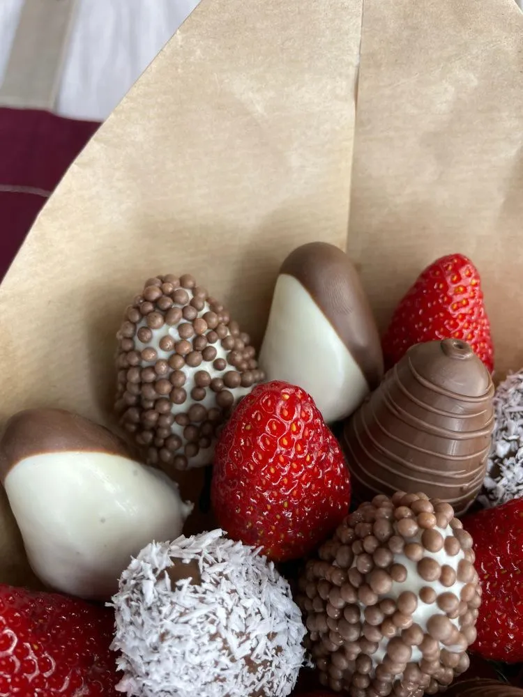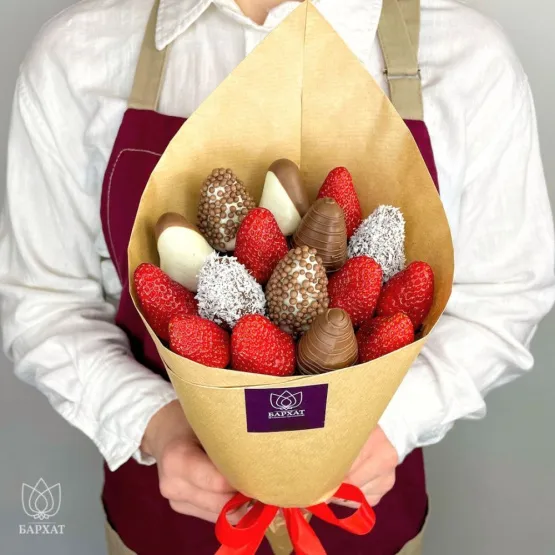 Мы собираем клубничные букеты по весу, а не по штукам. Количество, форма и размер ягод могут отличаться — ведь каждая ягода уникальна.