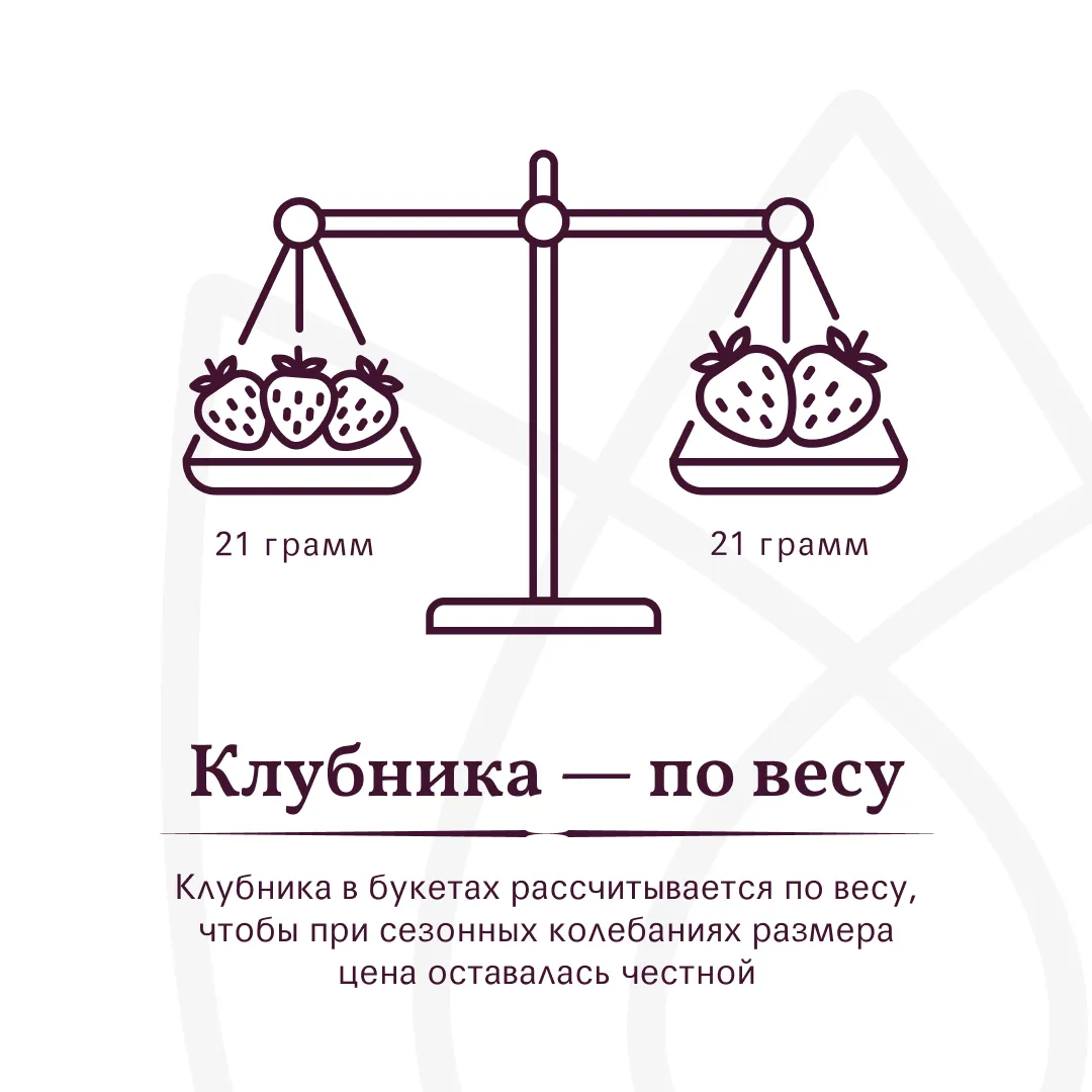 Мы собираем клубничные букеты по весу, а не по штукам. Количество, форма и размер ягод могут отличаться — ведь каждая ягода уникальна.