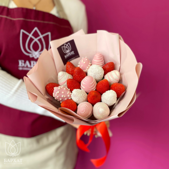 Мы собираем клубничные букеты по весу, а не по штукам. Количество, форма и размер ягод могут отличаться — ведь каждая ягода уникальна.