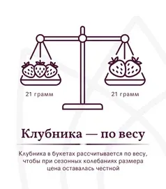Мы собираем клубничные букеты по весу, а не по штукам. Количество, форма и размер ягод могут отличаться — ведь каждая ягода уникальна.