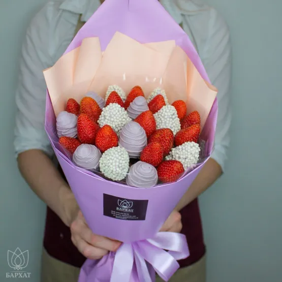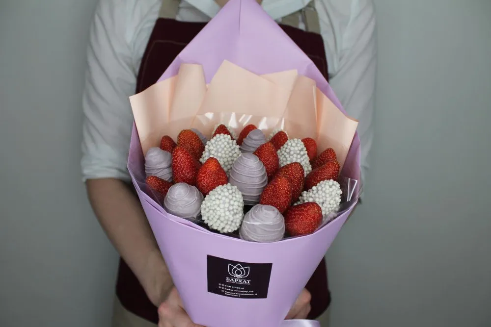 Мы собираем клубничные букеты по весу, а не по штукам. Количество, форма и размер ягод могут отличаться — ведь каждая ягода уникальна.