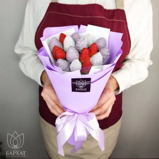 Мы собираем клубничные букеты по весу, а не по штукам. Количество, форма и размер ягод могут отличаться — ведь каждая ягода уникальна.