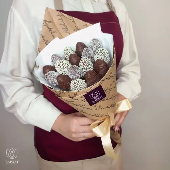 *Обратите внимание: изображение в карточке товара носит иллюстративный характер — реальный букет может незначительно отличаться от фото (например, по размеру клубники, форме и сборке). Точные размеры букета указаны в карточке товара.