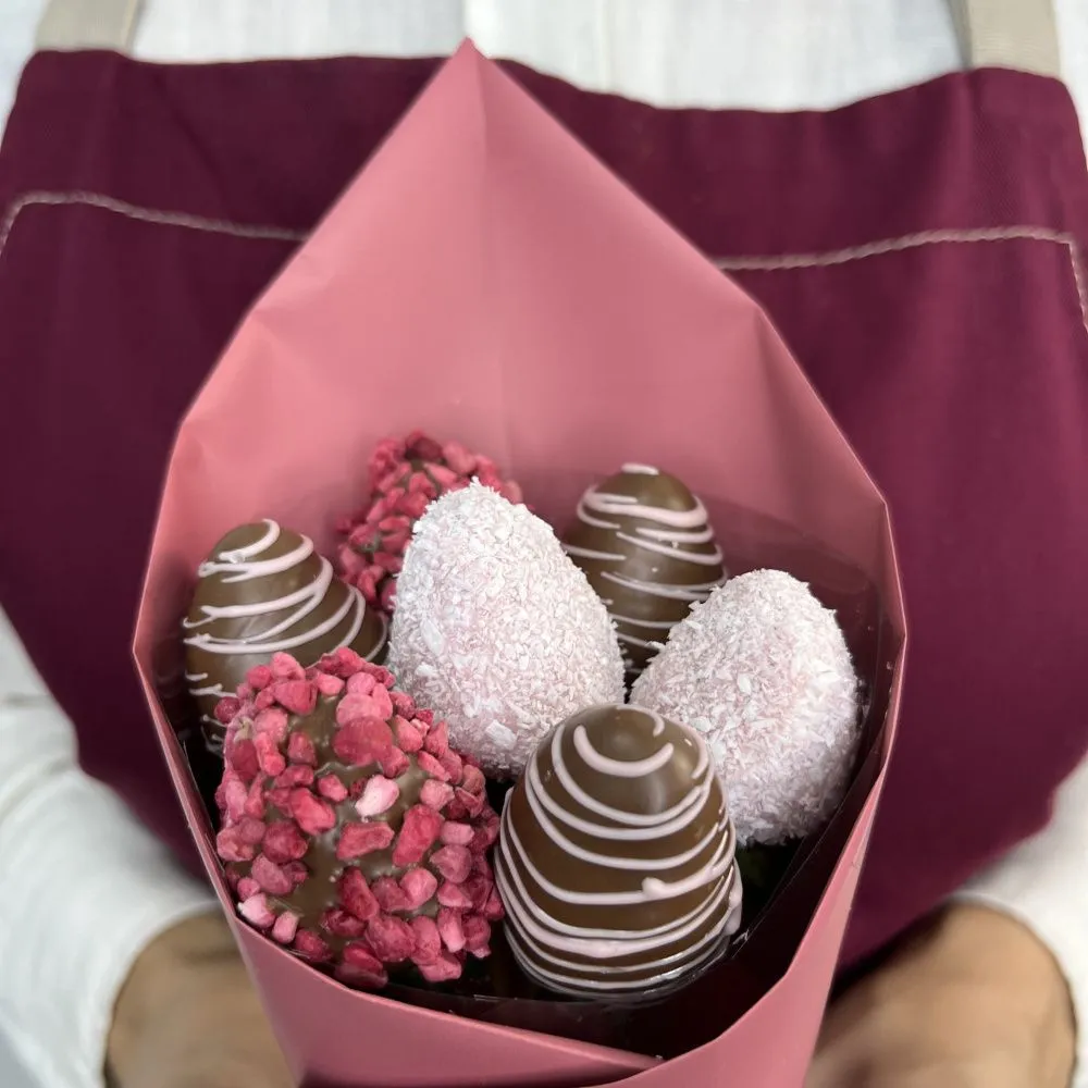 Мы собираем клубничные букеты по весу, а не по штукам. Количество, форма и размер ягод могут отличаться — ведь каждая ягода уникальна.
