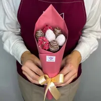 Состав: клубника в шоколаде 100 г. Букет из свежей клубники в бельгийском шоколаде. Клубника держится на каркасе из шпажек. Готовый букет упаковывается в прозрачную слюду. Фирменная открытка-инструкция по хранению — в подарок. Этот букет — идеальный способ выразить чувства: ко дню рождения, годовщине, 8 Марта, 14 Февраля, Дню матери, Дню учителя, Дню бабушки и дедушки или просто в знак внимания и заботы. Букет из клубники — съедобный букет — отличный подарок бабушке, маме, любимой женщине, жене, подруге, сестре, друзьям и коллеге.