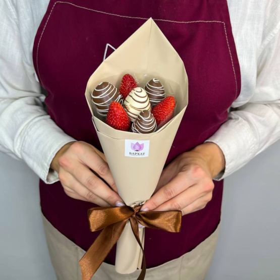 *Обратите внимание: изображение в карточке товара носит иллюстративный характер — реальный букет может незначительно отличаться от фото (например, по размеру клубники, форме и сборке). Точные размеры букета указаны в карточке товара.