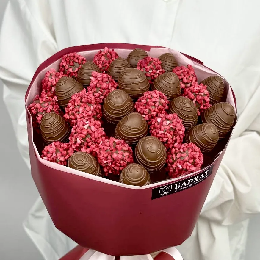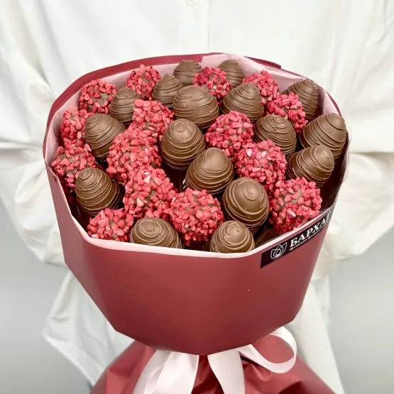 *Обратите внимание: изображение в карточке товара носит иллюстративный характер — реальный букет может незначительно отличаться от фото (например, по размеру клубники, форме и сборке). Точные размеры букета указаны в карточке товара.