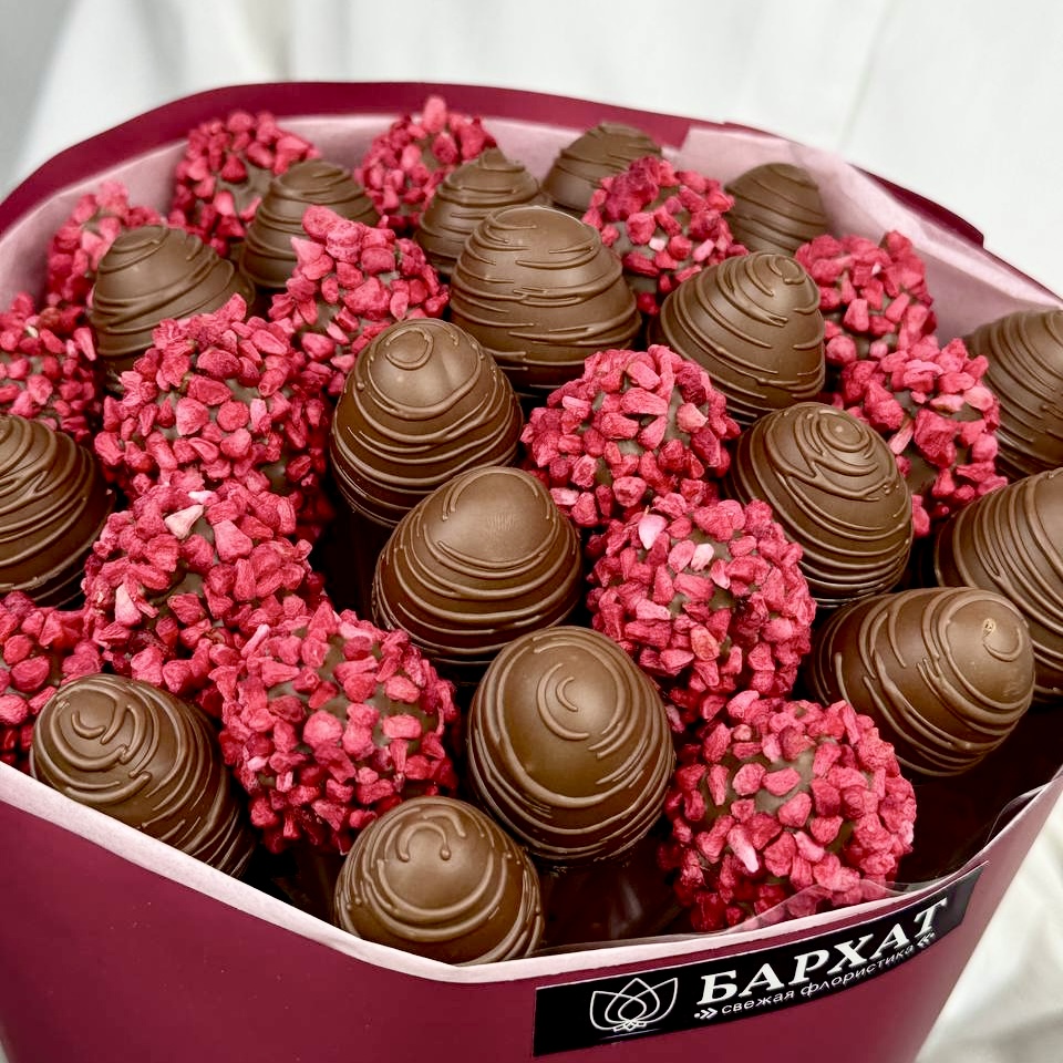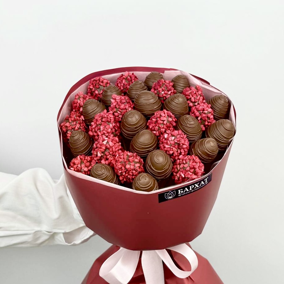 Мы собираем клубничные букеты по весу, а не по штукам. Количество, форма и размер ягод могут отличаться — ведь каждая ягода уникальна.