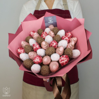 Мы собираем клубничные букеты по весу, а не по штукам. Количество, форма и размер ягод могут отличаться — ведь каждая ягода уникальна.