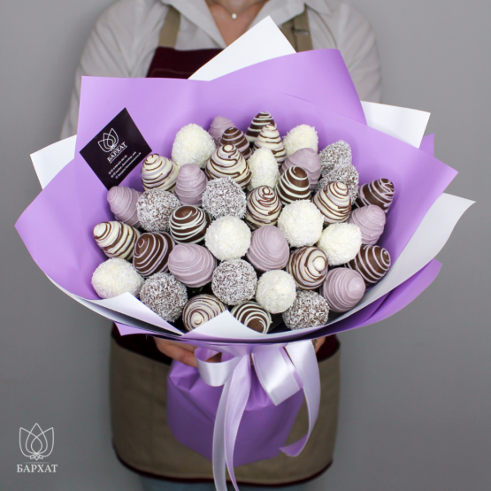 Мы собираем клубничные букеты по весу, а не по штукам. Количество, форма и размер ягод могут отличаться — ведь каждая ягода уникальна.