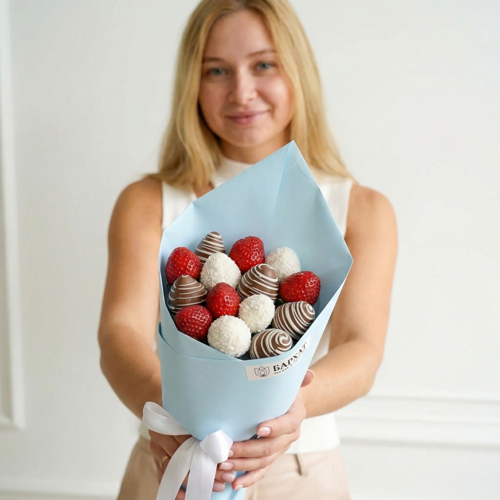 Мы собираем клубничные букеты по весу, а не по штукам. Количество, форма и размер ягод могут отличаться — ведь каждая ягода уникальна.