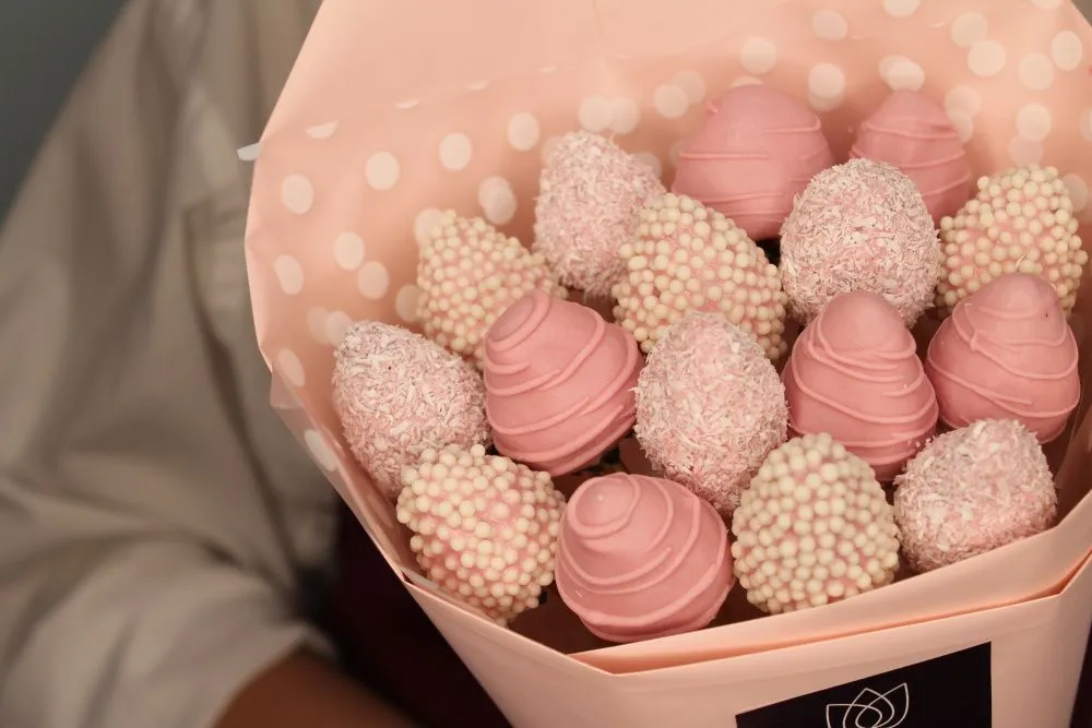 Мы собираем клубничные букеты по весу, а не по штукам. Количество, форма и размер ягод могут отличаться — ведь каждая ягода уникальна.