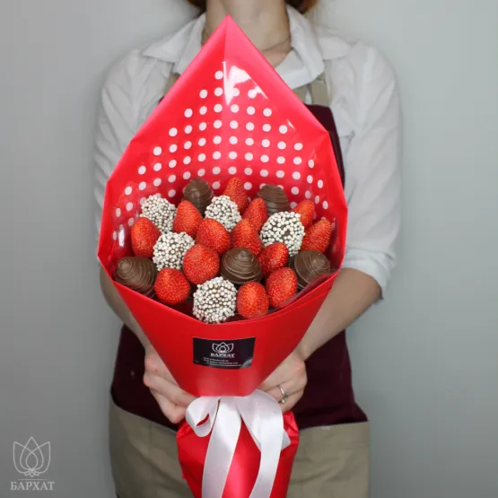 Мы собираем клубничные букеты по весу, а не по штукам. Количество, форма и размер ягод могут отличаться — ведь каждая ягода уникальна.