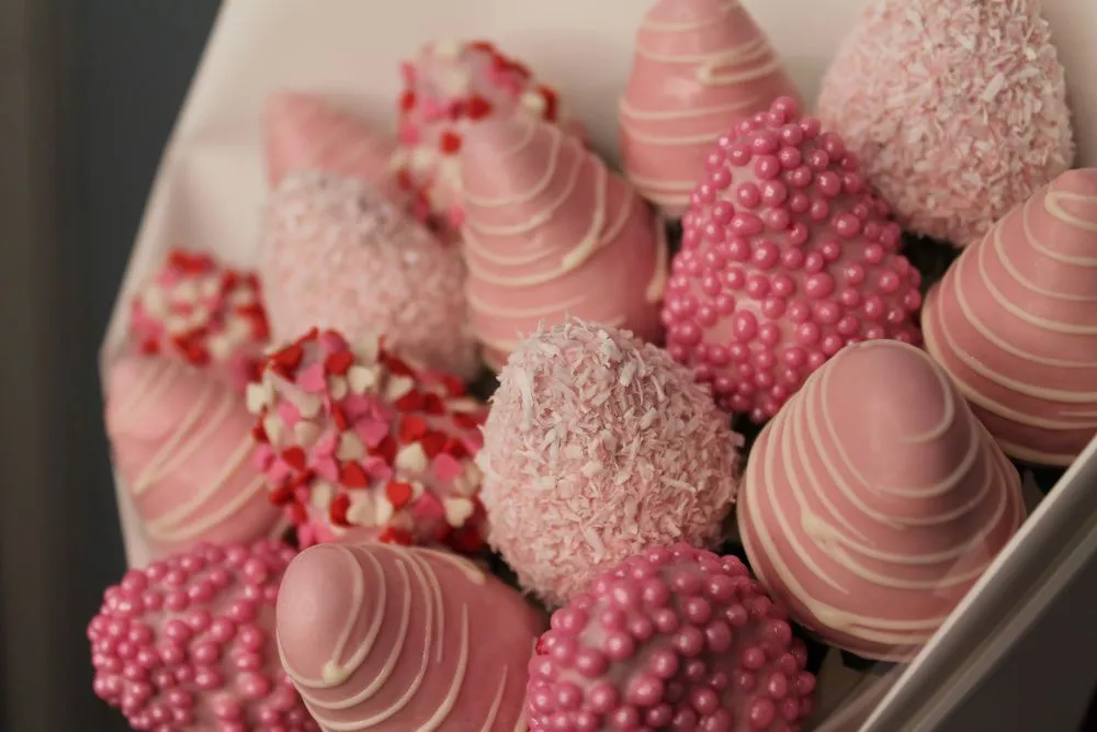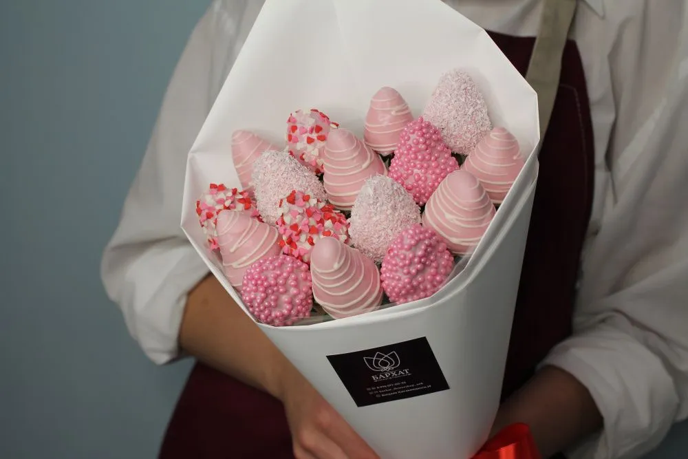 Мы собираем клубничные букеты по весу, а не по штукам. Количество, форма и размер ягод могут отличаться — ведь каждая ягода уникальна.