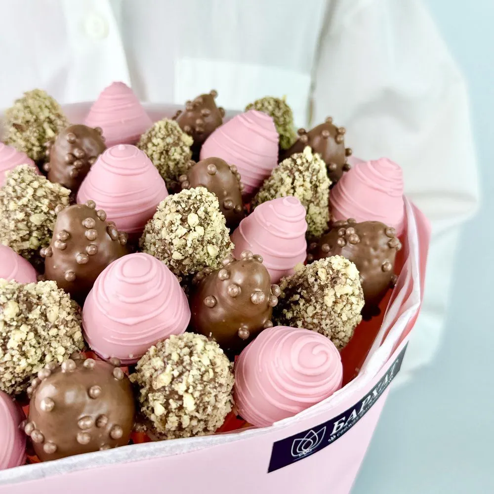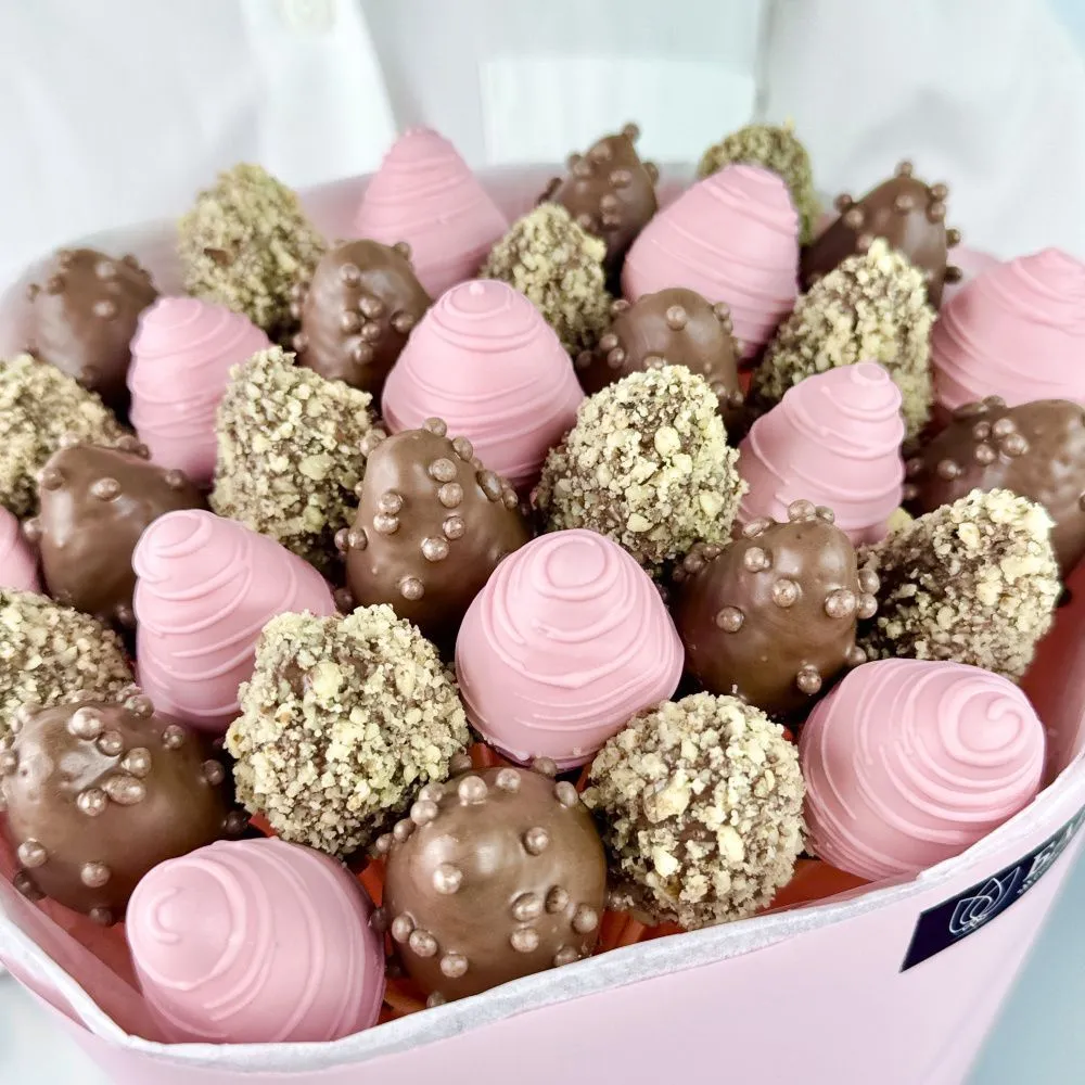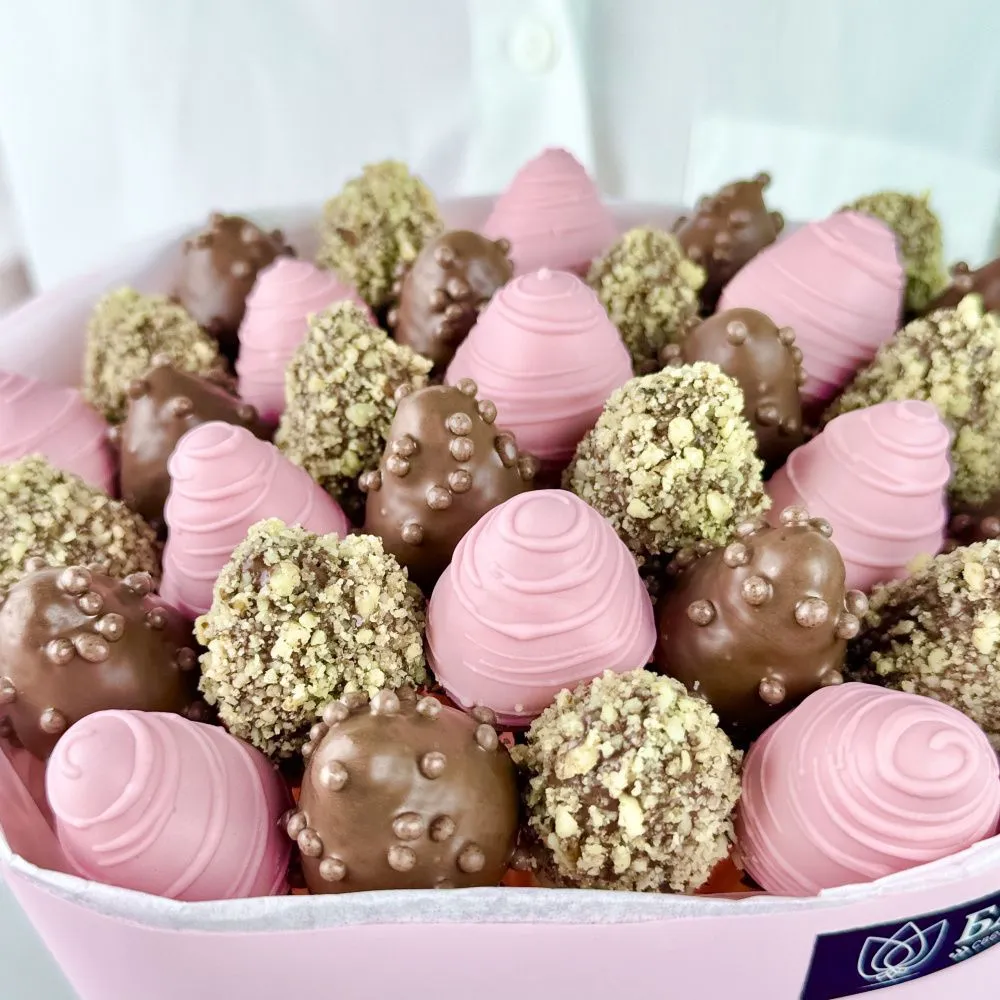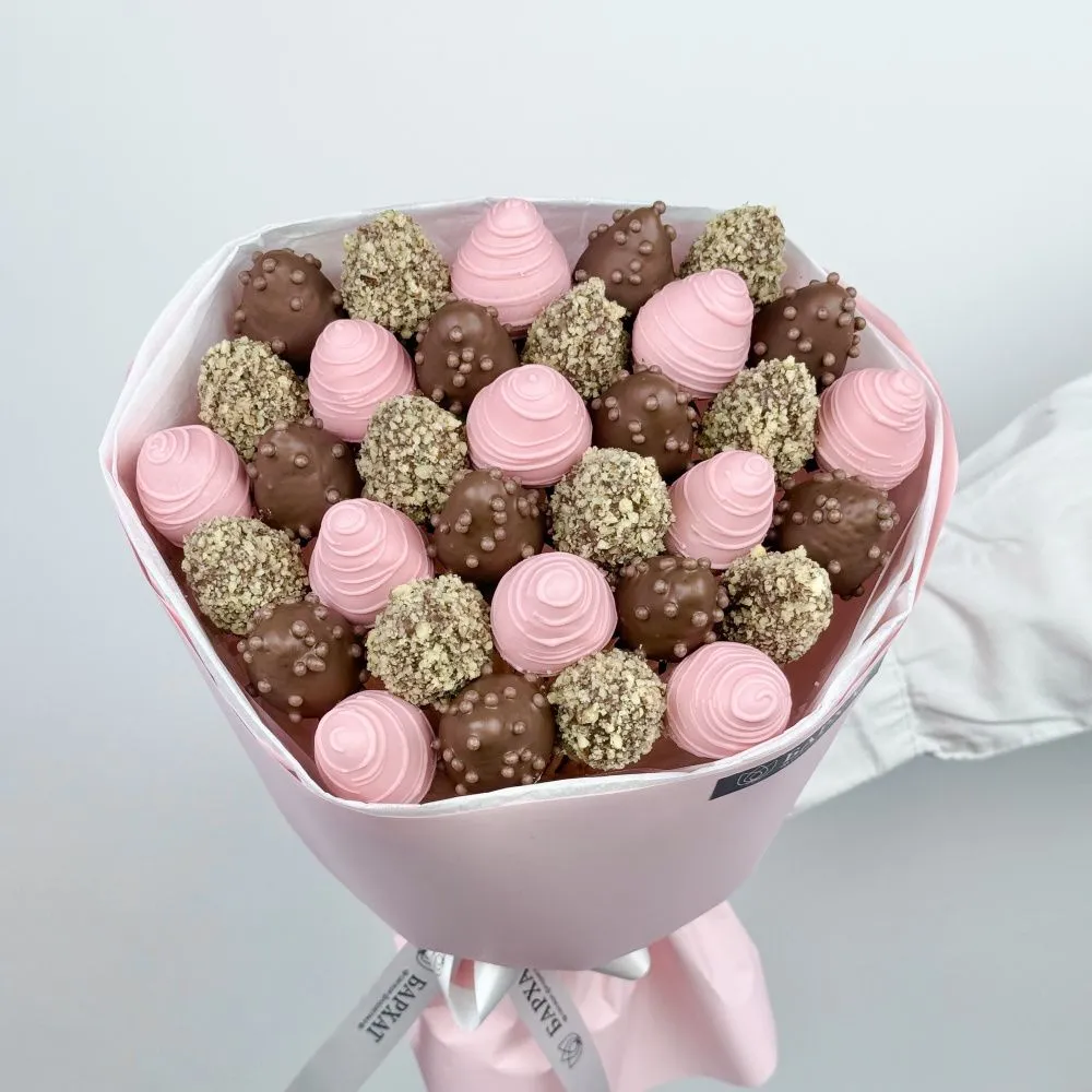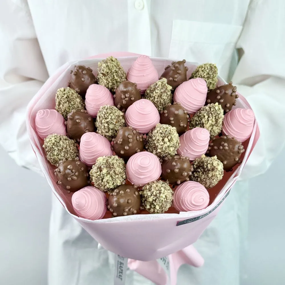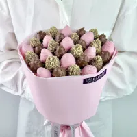*Обратите внимание: изображение в карточке товара носит иллюстративный характер — реальный букет может незначительно отличаться от фото (например, по размеру клубники, форме и сборке). Точные размеры букета указаны в карточке товара.