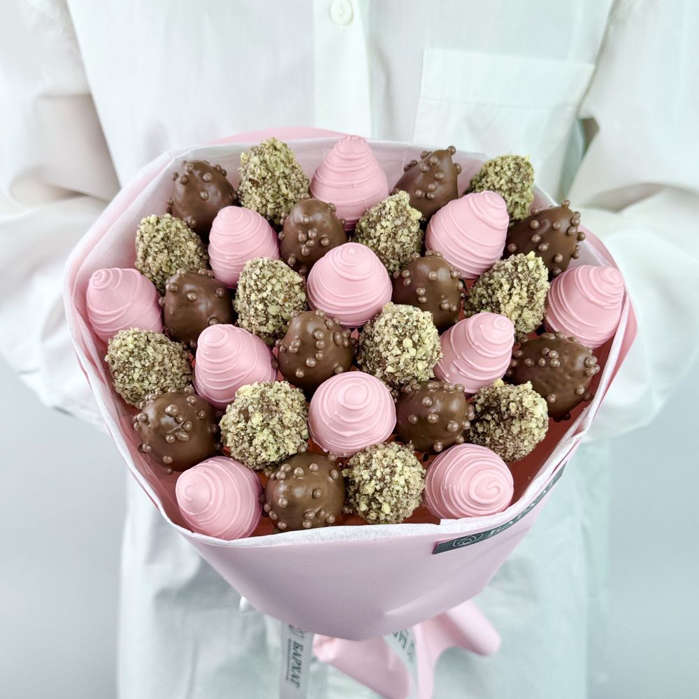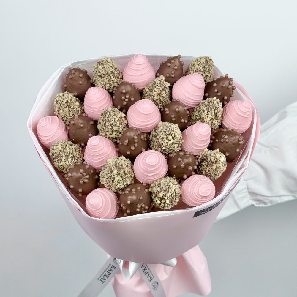 Мы собираем клубничные букеты по весу, а не по штукам. Количество, форма и размер ягод могут отличаться — ведь каждая ягода уникальна.