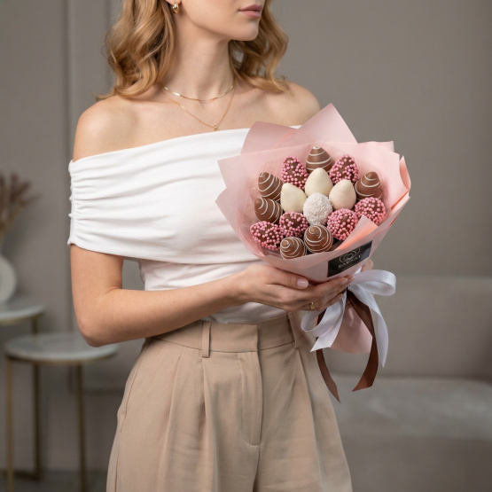 *Обратите внимание: изображение в карточке товара носит иллюстративный характер — реальный букет может незначительно отличаться от фото (например, по размеру клубники, форме и сборке). Точные размеры букета указаны в карточке товара.