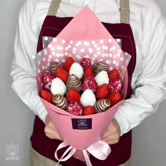 Мы собираем клубничные букеты по весу, а не по штукам. Количество, форма и размер ягод могут отличаться — ведь каждая ягода уникальна.