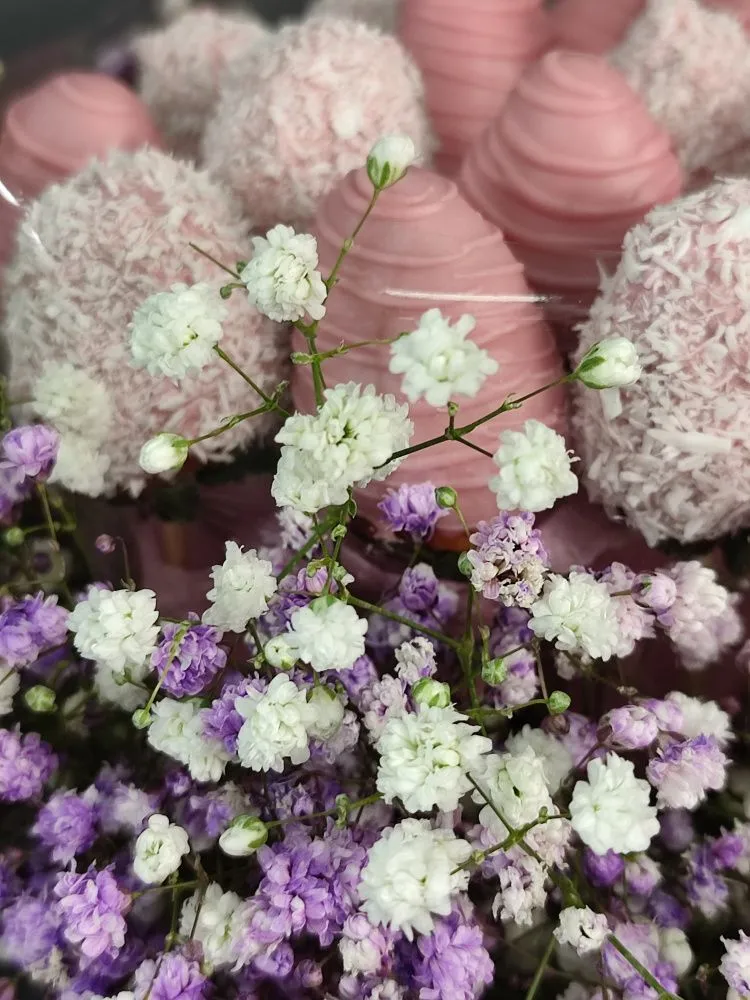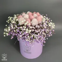 Мы собираем клубничные букеты по весу, а не по штукам. Количество, форма и размер ягод могут отличаться — ведь каждая ягода уникальна.