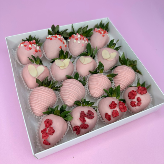 Коробочка свежей клубники в фирменном шоколаде — воплощение нежности и любви. В её основе — сочные ягоды отборной клубники Альбион, каждая из которых вручную окутана бархатистым шоколадом и украшена изящными посыпками. Это безупречный подарок для самого романтичного дня в году — 14 февраля (Дня Святого Валентина).