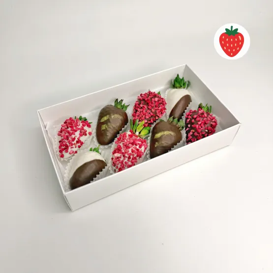 Коробочка свежей клубники в фирменном шоколаде. В основе — сочные и сладкие ягоды отборной клубники Альбион, каждая из которых вручную окутана бархатистым фирменным шоколадом и украшена посыпками.